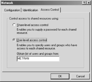 To configure the type of access control for your system, open the Control Panel, double-click the Network icon, then click the Access Control tab. You should see the dialog box shown in Figure 5-1.