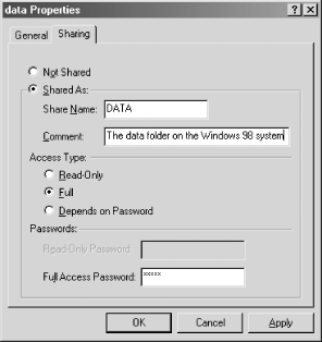 Figure 5-2 shows what the Sharing tab of the folder's Properties dialog box will look like when using share-level security. The security settings are very simple. You can select a radio button for read-only access or full (read/write) access, or have the user's permissions (either read-only or read/write) depend on which password they use. In accordance with which you select, you will be asked to assign either or both of the read-only and full-access passwords for the share.
