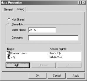 If your system is configured with user-level security, the Sharing tab of the folder's Properties dialog box will look like Figure 5-3. As you can see, we've created a share named "DATA", and used the Add . . . button to create permissions that allow read-only access for all domain users and read/write (full access) for jay.